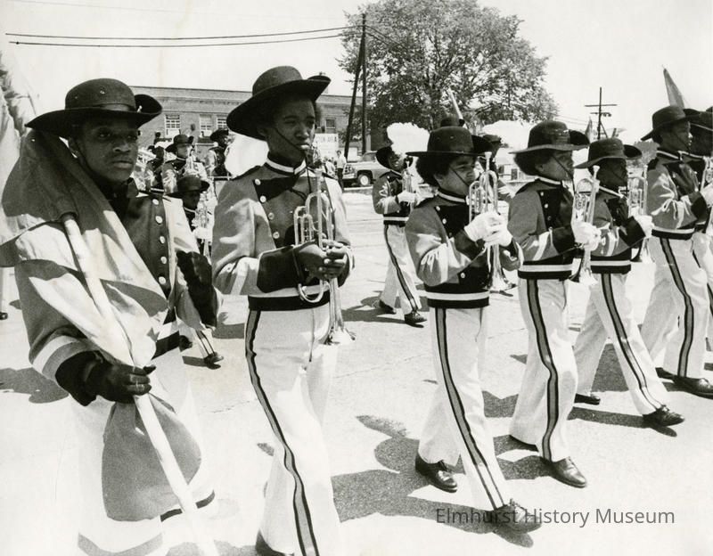 Members of a drum and bugle corps marching in Elmhurst's Independence Day paradePhotograph Details