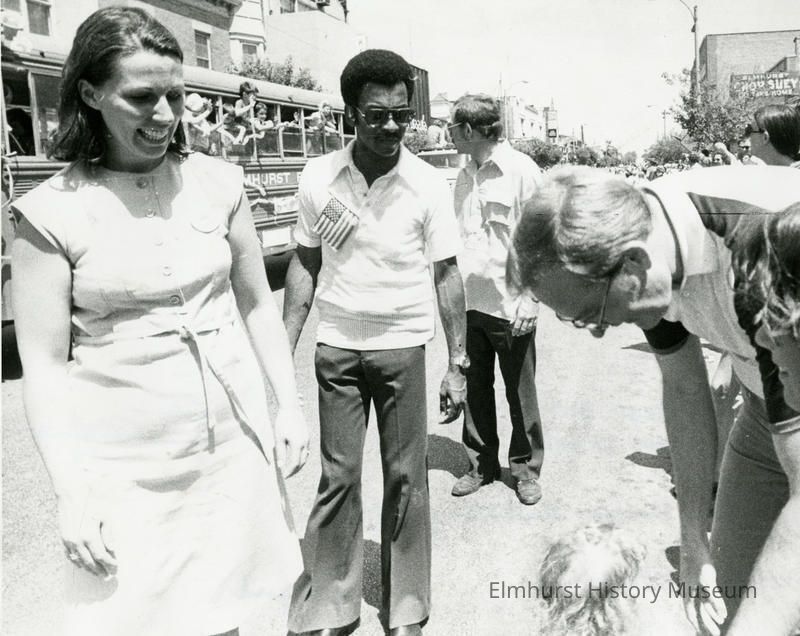 Elmhurst Independence Day parade, Illinois Governor James Thompson is speaking to a young girl. His wife, Jayne Thompson is to the left.Photograph Details