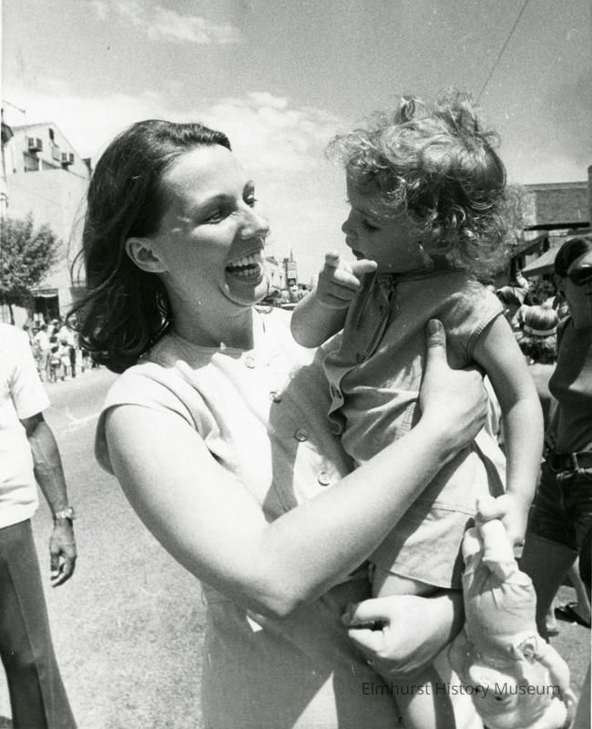 Jayne Thompson, wife of Illinois Governor James Thompson, holding a young parade spectatorPhotograph Details