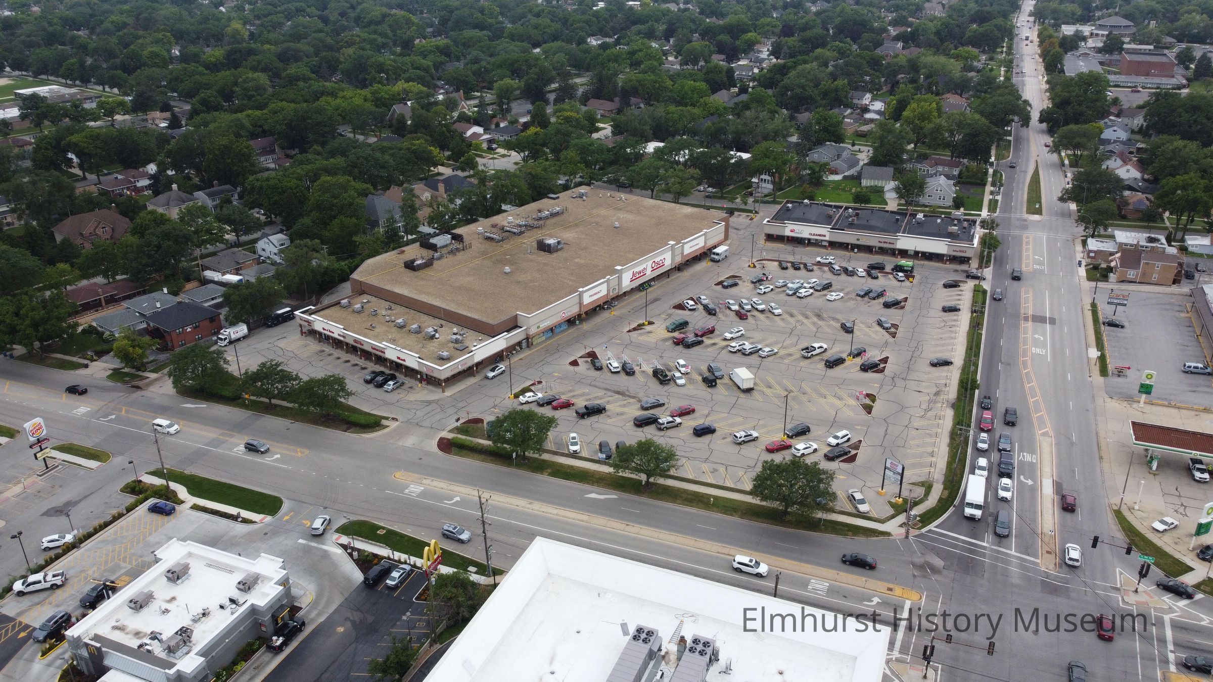 Aerial view of the intersection of S. York Street and Butterfield Road, looking northwest at the Elmhurst Plaza shopping center.Photograph Details