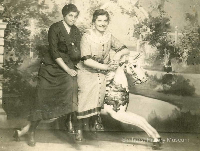 Black and white photographic postcard. Studio portrait of two women seated on carousel horse. Woman on the right has been identified as Jane Warkentien.Photograph Details