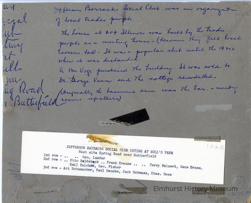 on back: Jefferson Barracks social club was an organization of local trades people. The house at 204 Illinois was built by the trades people as a meeting house (because they felt local taverns bad). It was a popular club until the 1920s when it was disbanded.