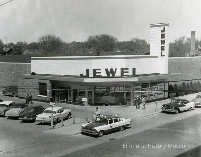 On back: Jewel Tea Company / 119 Schiller St. - 1957 / Later remodeled for City Hall 1970 / Elmhurst Business Area - 1957 / Schiller St. / Publ.Lib. Elmhurst, IL / R. Le Sage photos
