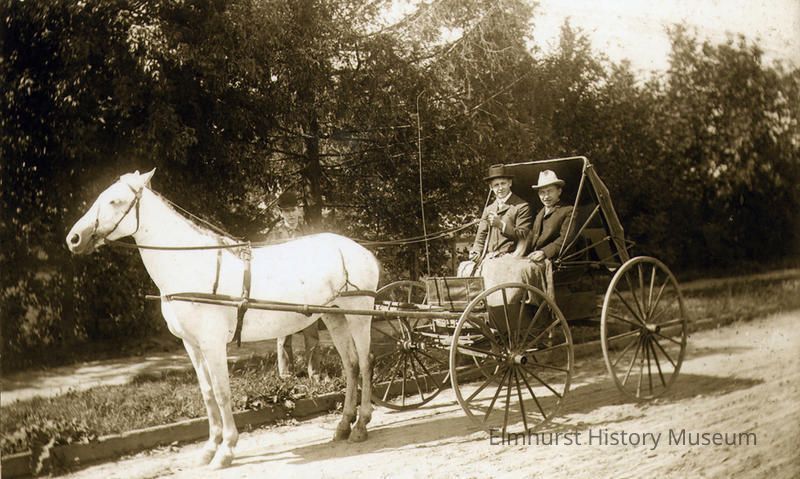 Two men in a buggy on an unpaved road. The man on the right is identified as Elmhurst resident Julius BraunPhotograph Details