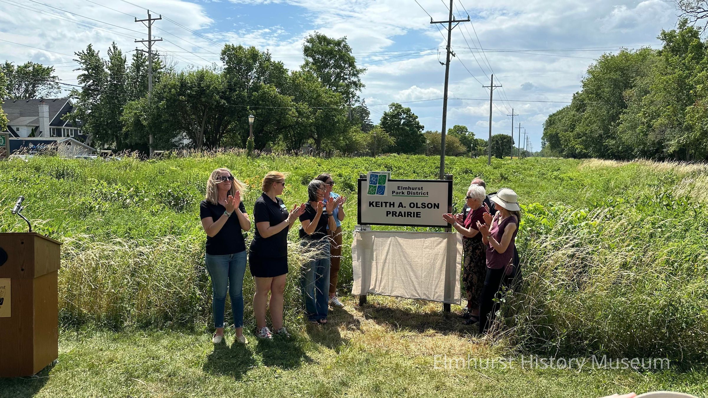 Sign unveiling at the dedication ceremony for the Keith A. Olson Prairie, formerly known as the Elmhurst Great Western Prairie. The prairie was renamed for long-time volunteer and preservationist Keith Olson, who passed away in January 2024.Photograph Details