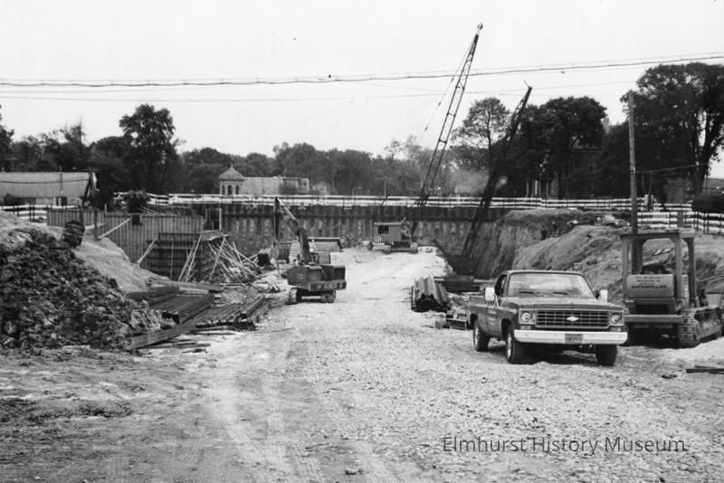 Elmhurst underpass construction looking south from the north side of the railroad tracks, showing piles of dirt and construction supplies, a pickup truck and small construction vehicles.Photograph Details