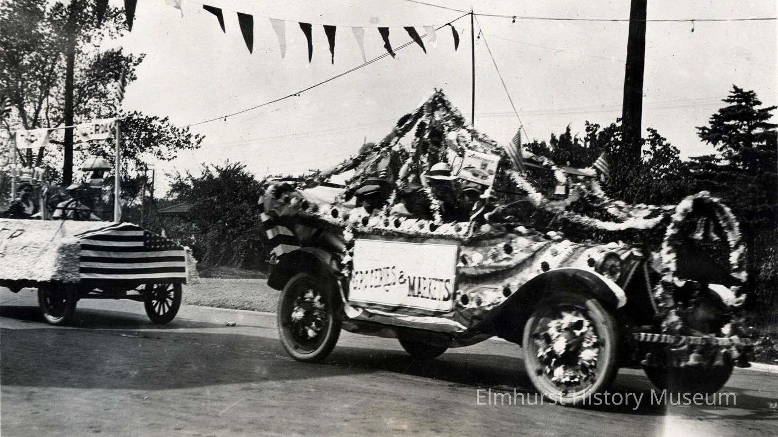 Decorated automobile float for a grocery store on Park Avenue in the 1921 Labor Day parade, celebrating the paving of York Street in downtown Elmhurst.Photograph Details