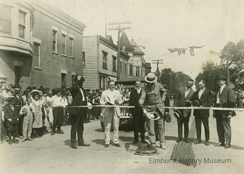 Ribbon-cutting ceremony to celebrate the paving of York Street during the Labor Day parade. Mayor Otto Balgemann is cutting the ribbon. The location is N. York Street just north of First Street, looking north.Photograph Details
