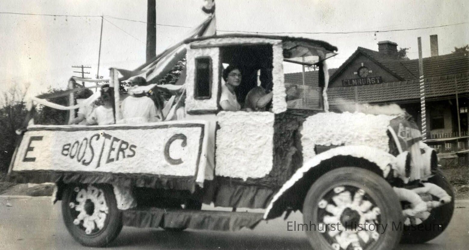 Elmhurst Boosters (later Chamber of Commerce) float on Park Avenue in the 1921 Labor Day Parade, celebrating the paving of York Street in downtown Elmhurst.Photograph Details