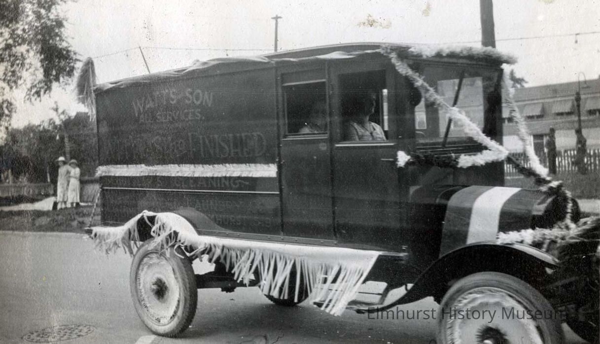 Watts & Son Laundry Company parade float on Park Avenue in the 1921 Labor Day Parade, celebrating the paving of York Street in downtown Elmhurst.Photograph Details