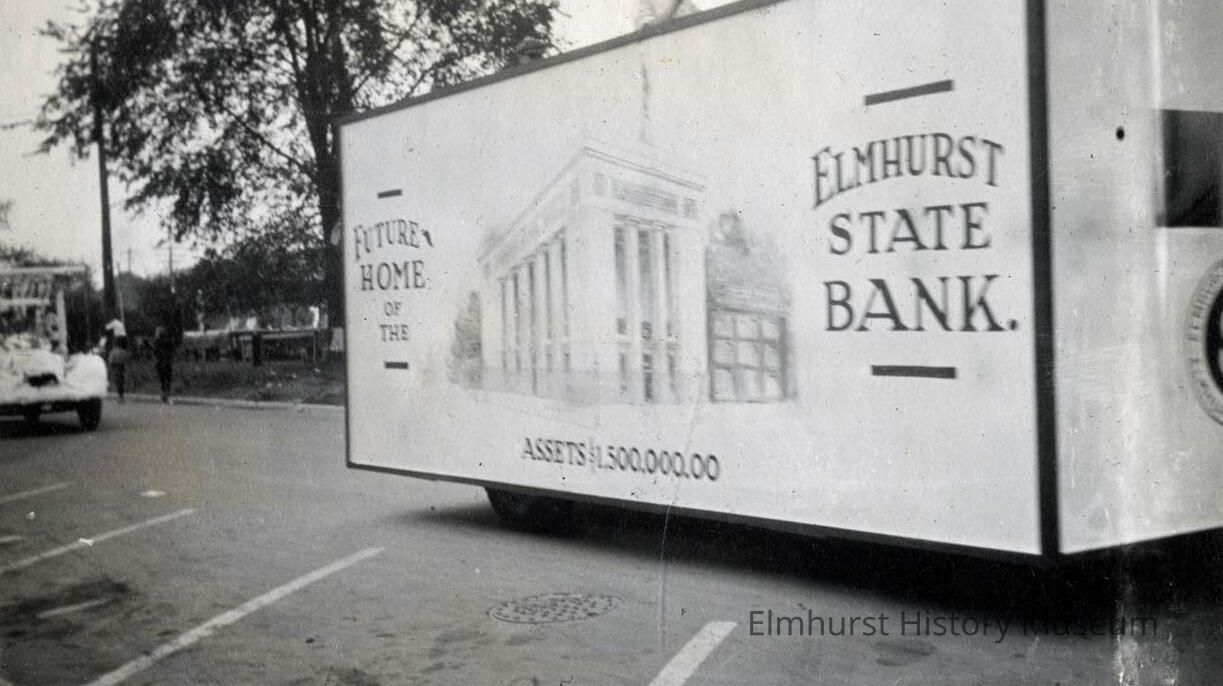 Elmhurst State Bank float, showing a future building design and location, on Park Avenue in the 1921 Labor Day Parade, celebrating the paving of York Street in downtown Elmhurst.Photograph Details