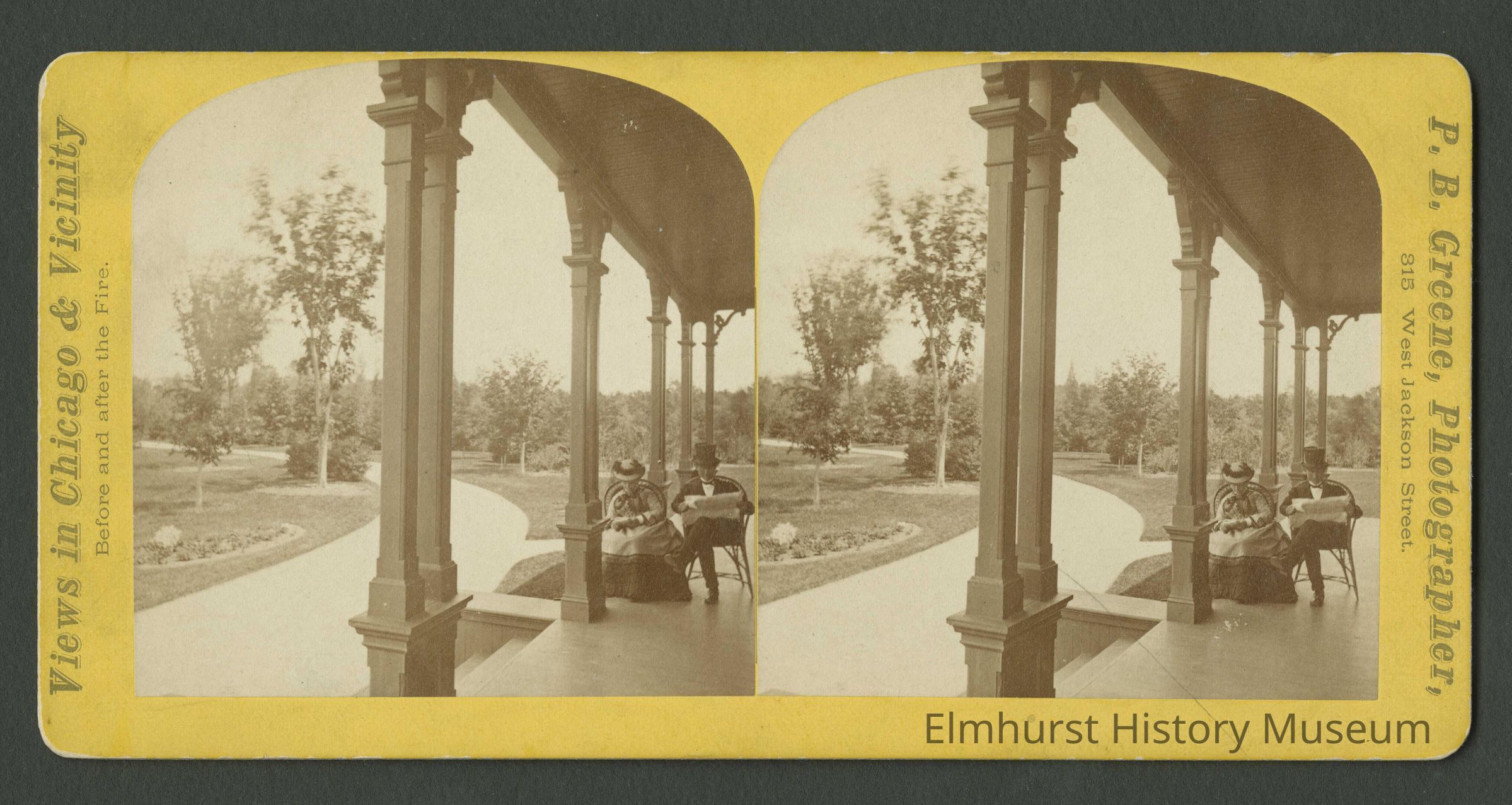 Mr. Jedediah and Mrs. Marianna Lathrop seated on the front porch of their estate, Huntington, in Elmhurst. The estate was on the south side of St. Charles Road at Prospect Avenue.Photograph Details