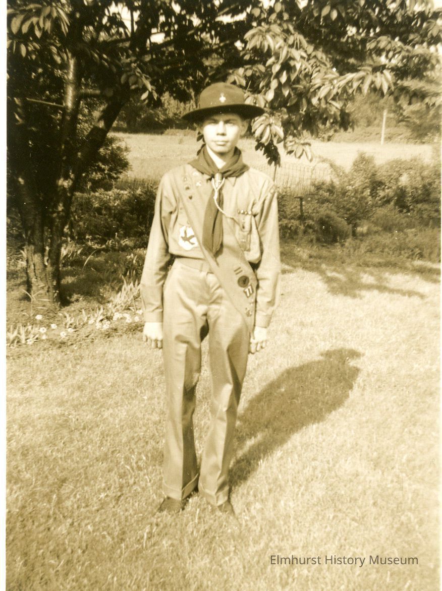 Photograph of Lawrence Prindiville in Boy Scout uniform, Troop 77, Immaculate Conception School.