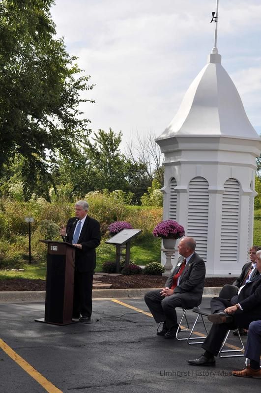 Former State Representative Lee A. Daniels speaks at the restored Elmhurst Memorial Hospital Cupola at Elmhurst Community Bank at 330 W. Butterfield Road.Photograph Details