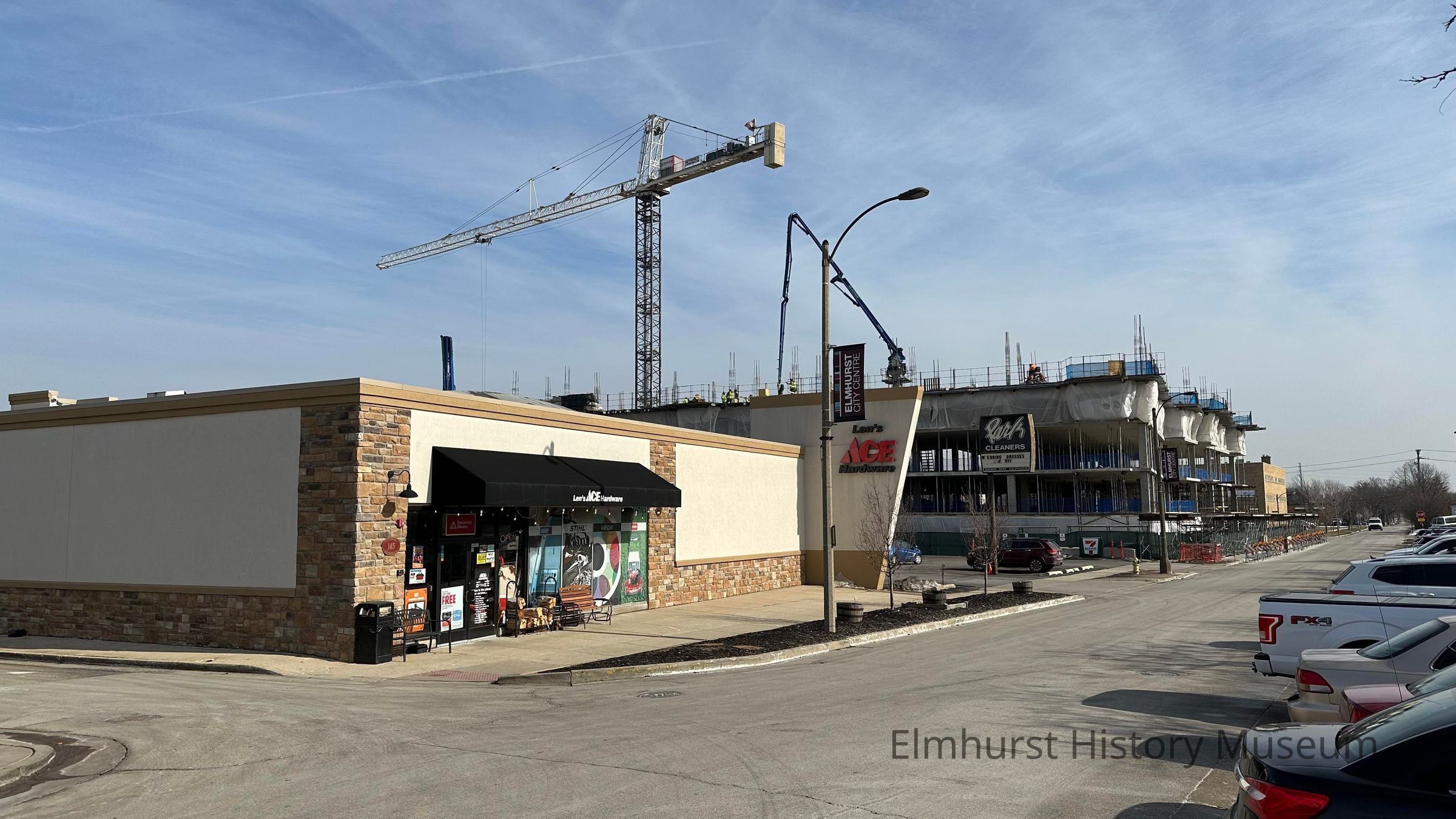 Len's Ace Hardware store at 145 E. First Street, looking east. The Vyne on Haven apartment building is under construction in the background.Photograph Details