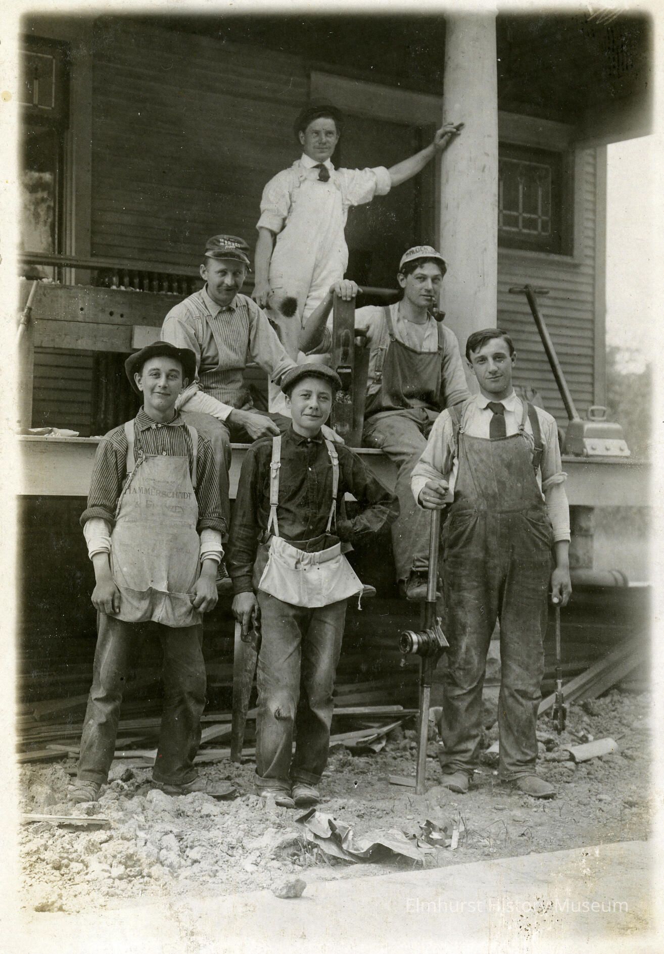 Edward C. Licht and 5 workers from his E.C. Licht Plumbing and Heating company at a job site on Larch Avenue (145 N. Larch?). Front row: left to right: Emil Giese, xx Dunike, Ed Licht; middle row: William Hanebuth and Gus Balgemann, top row: unidentified. Postcard is unused.Photograph Details
