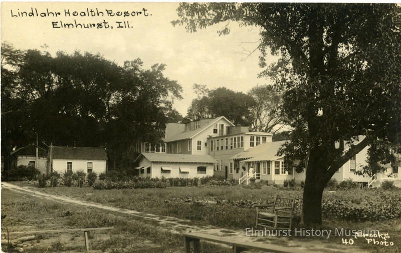 Lindlahr Health Resort. Image shows a sprawling establishment. Printing on front upper left reads "Lindlahr Health Resort, Elmhurst, Ill." Printing on front lower right identifies photo as "Brooks Photo. 40" and card published by H.C. Brooks, Chicago. Card has not been used.Photograph Details