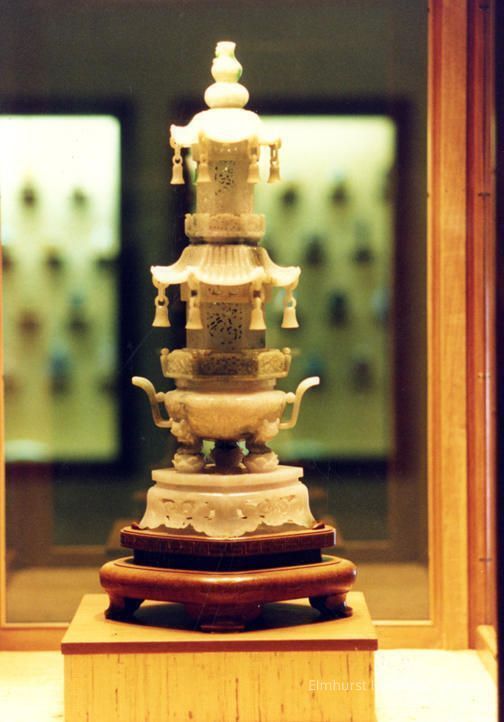 Tiered carved object of wood and jade. Location of object is identified on the back, in ink, as "Lizzadro Museum of Lapidary Art / March 1994."Photograph Details