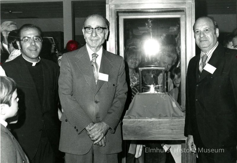 Joseph Lizzadro and others posing in front of the moon rock display at the Lizzadro Museum of Lapidary Art, 220 S. Cottage HillPhotograph Details