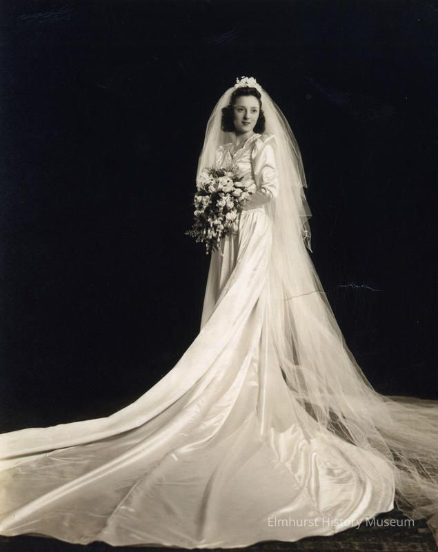 Bridal portrait of Lorraine Bugarewicz Colwell wearing a white satin dress with a long train. The wedding united Lorraine Bugarewicz and Albert Atwood "Woody" Colwell at Immaculate Conception Church on April 25, 1942. (Note: This dress is 2006.26.1)Photograph Details