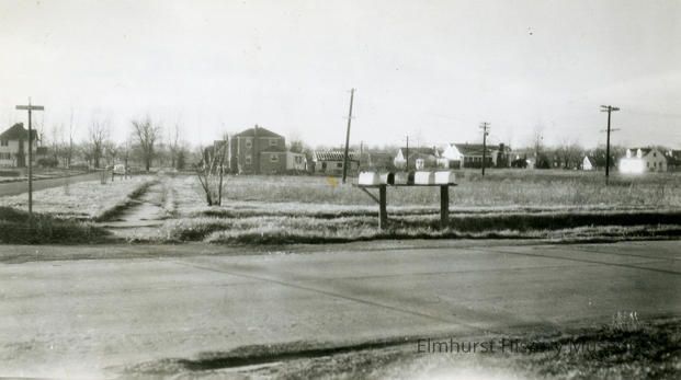 Written in cursive on the back: Our lot at York Road and Oneida Ave., Elmhurst, Ill. Taken the middle of Nov., 1949. / Looking west