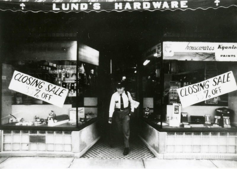 Closing sale at Lund Hardware Store front at 132 Addison Avenue.Photograph Details