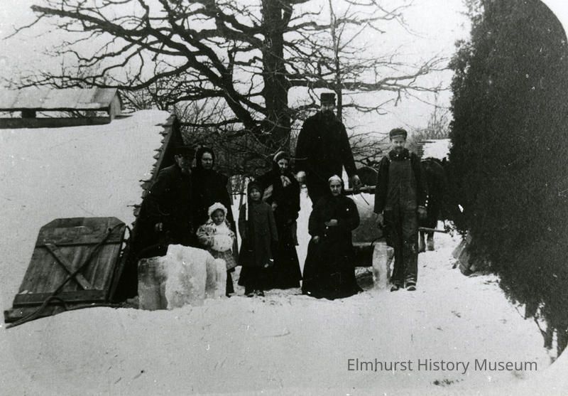 Group of six adults and two children pose while making ice on the Harger Farm, east of Spring Road.Photograph Details