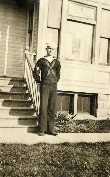 Young man dressed in U.S. Navy uniform standing in front of a house.