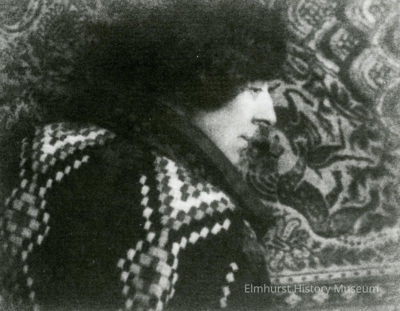 Portrait of architect Marion Mahony Griffin in profile against a patterned textile backdropPhotograph Details