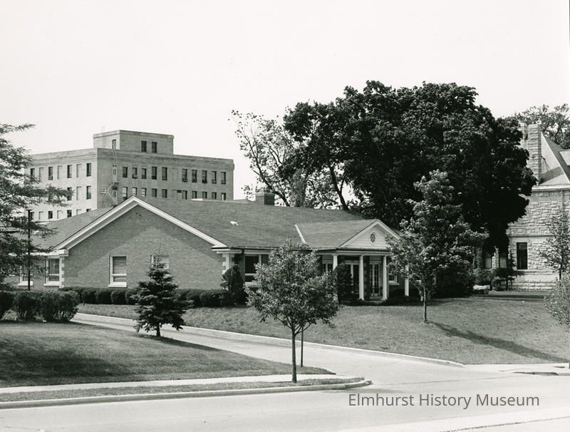 Written notes on back: Looking N.W. / Medical Arts Building / 120 S. Palmer Drive / Elmhurst, IL Cataloger's note: In 2011 this building serves as the Museum's Education Center.