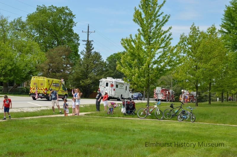 Elmhurst Memorial Day Convoy parade on Butterfield Road, part of a 16 mile route of military, police, and fire vehicles to replace the traditional parade due to Covid-19 coronavirus concerns.Photograph Details