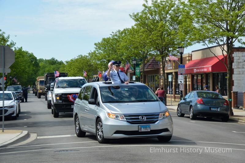 Elmhurst Memorial Day Convoy parade on Spring Road, part of a 16 mile route of military, police, and fire vehicles to replace the traditional parade due to Covid-19 coronavirus concerns.Photograph Details