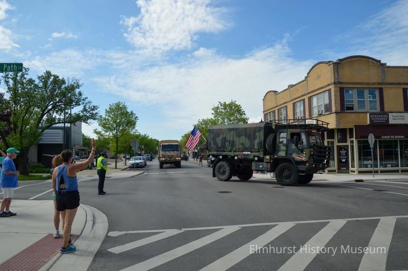 Elmhurst Memorial Day Convoy parade on Spring Road, part of a 16 mile route of military, police, and fire vehicles to replace the traditional parade due to Covid-19 coronavirus concerns.Photograph Details