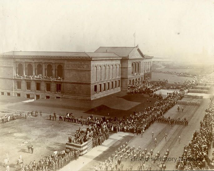 On paper affixed to back: O.G. Fischer Church Rd. R.F.D. #1 Bensenville, Illinois Photo taken 1898 Memorial Day Parade on Michigan Ave. near the Art Institute.