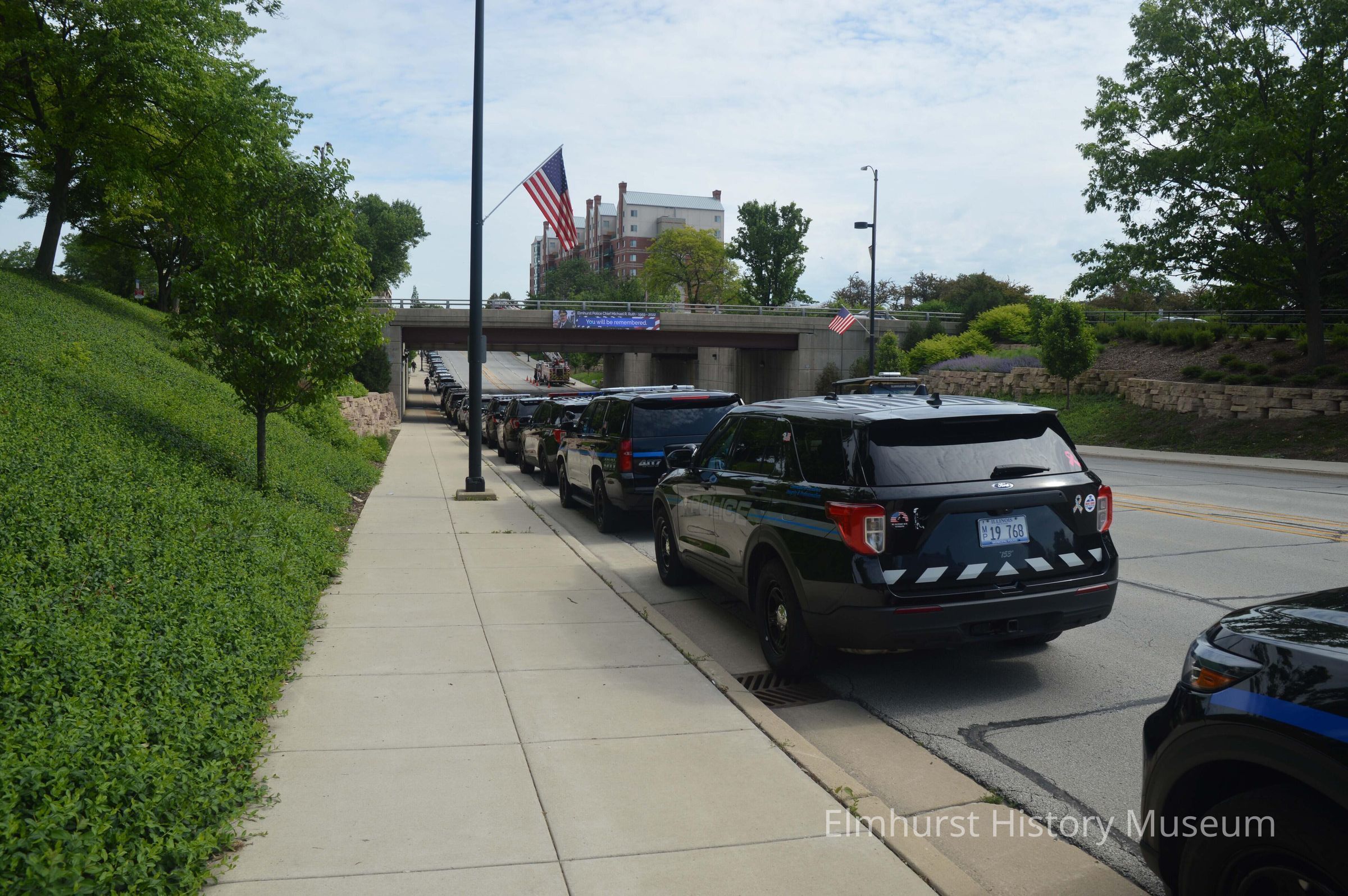 Police cars line Robert Palmer Drive during the memorial service for Elmhurst Police Chief Michael R. Ruth, who passed away on May 30, 2022.Photograph Details