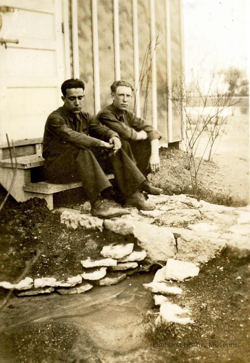 Two men sit at a barracks step at CCC Camp Elmhurst.