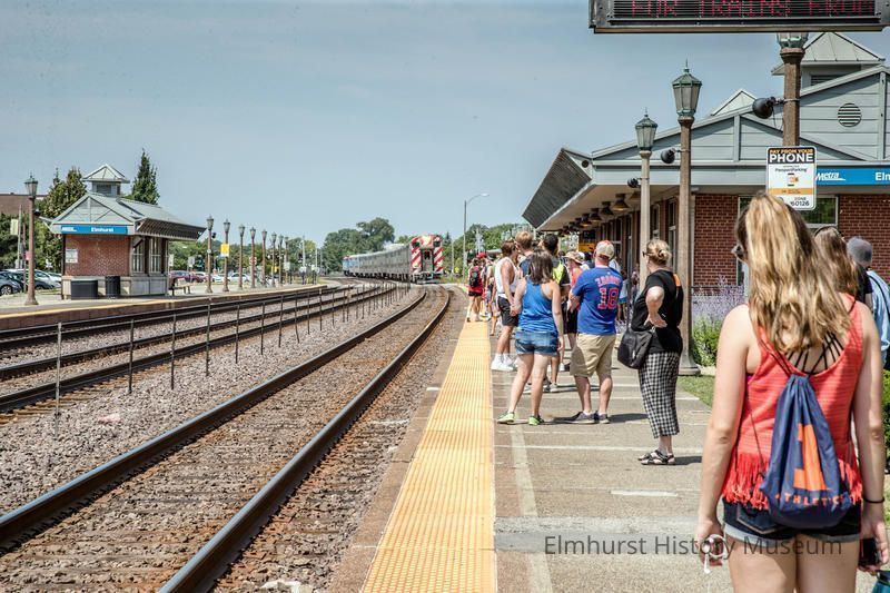 East-bound train at the Metra Station on W. First Street, looking west. Commuters are waiting on the platform.Photograph Details