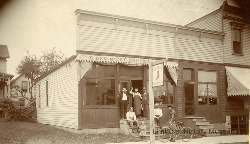 Miche Boot Shop at 128 S. York and Otto Strauschild Harness Shop at 126 S. York. Ben Miche is wearing the apron.Photograph Details