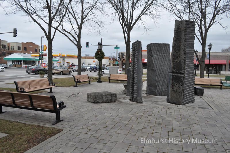Millennium Fountain at 209 N. York Street in Elmhurst City Hall's courtyard. Created by sculptor Dan Kainz, it was dedicated in 2002.Photograph Details