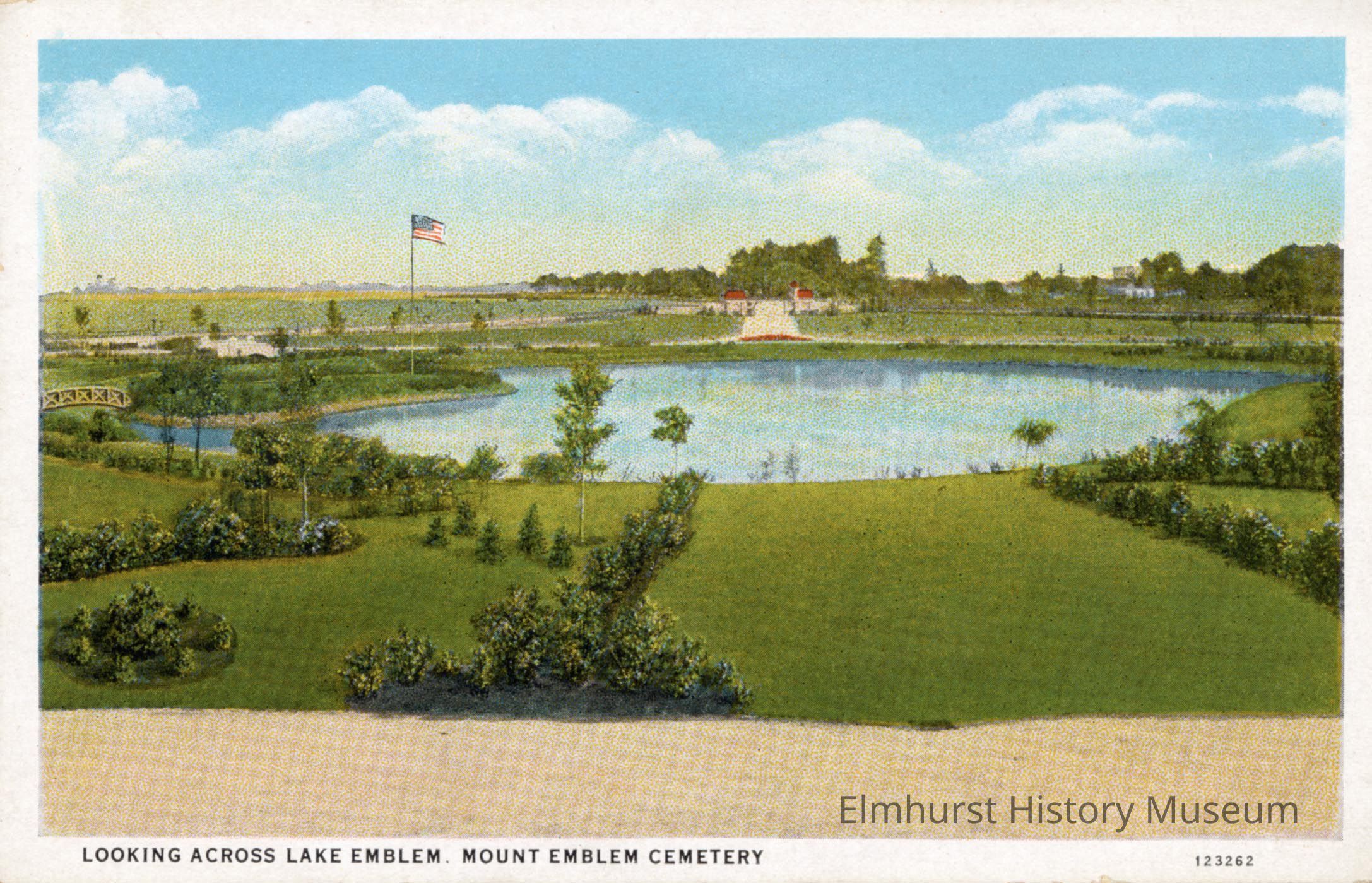 Postcard image of the lake and entrance gates at Mount Emblem Cemetery.