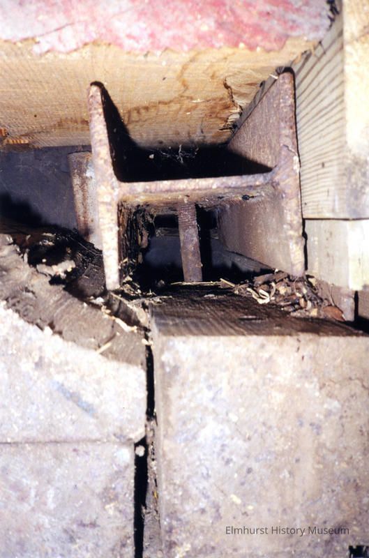 Internal damage to the Mount Emblem Cemetery windmill. The image is an I-beam section and rotting timbers.Photograph Details