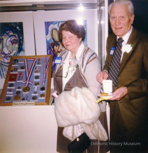 Mr. and Mrs. Robert and Eleanor King Hookham with her art medals in a case at the art show of her work at Elmhurst College.Photograph Details