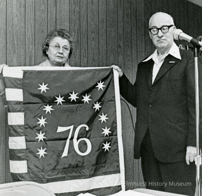 Mr. and Mrs. Gilligan holding a 1976 Bicentennial flag on a stage.Photograph Details