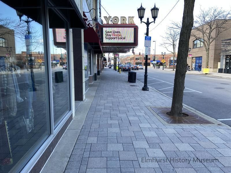 Looking north on the N. York Street sidewalk towards the York Theatre at 150 N. York. Marquee sign reads "Save Lives, Stay Home, Support Local."Photograph Details
