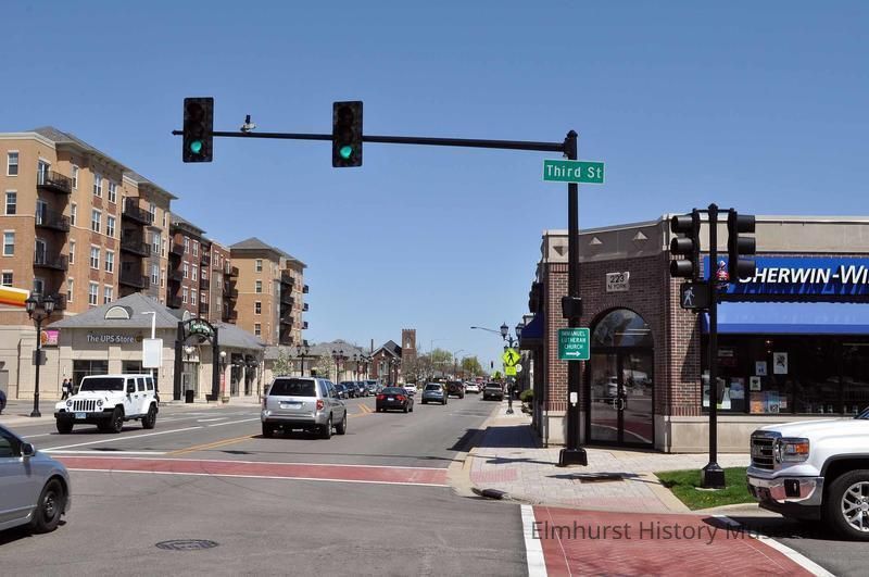 N. York Street looking north from Third Street. Sherwin Williams Paint Store is at right at 223 N. York.Photograph Details