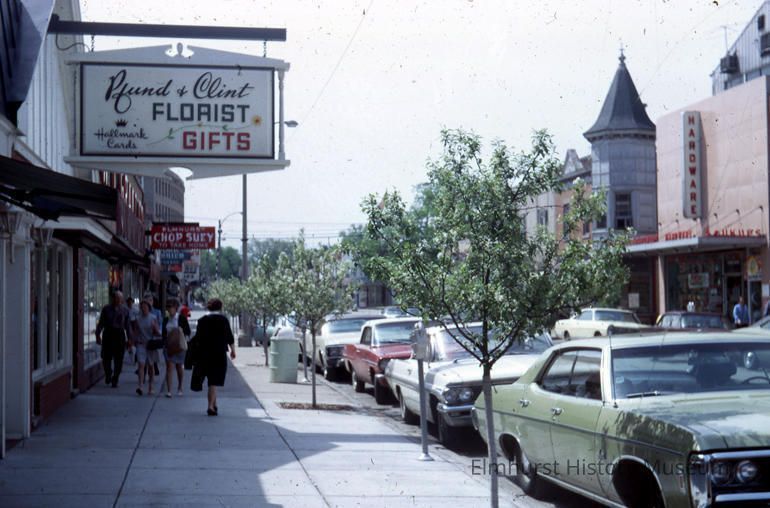 N. York Street, looking south towards First Street. Pfund and Clint Florists and Soukup's Hardware is visible in the background.Photograph Details