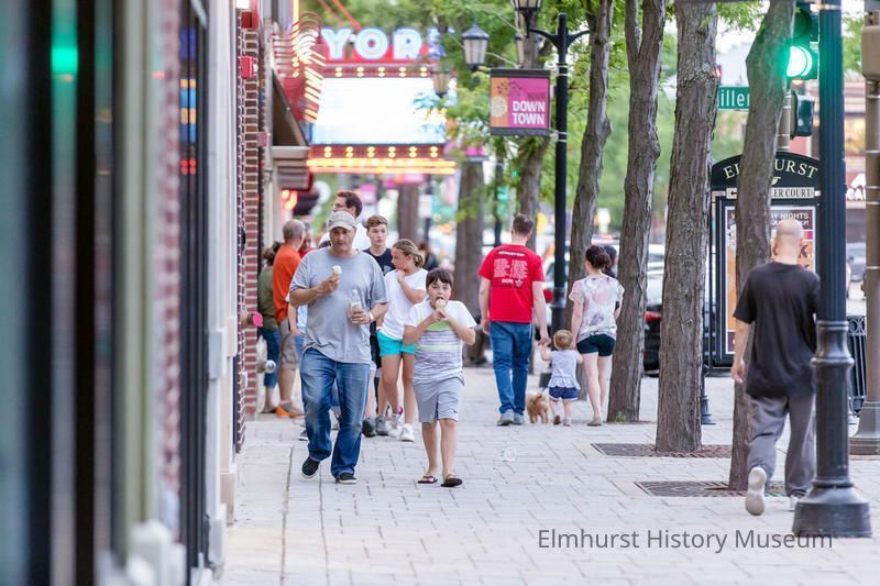 Pedestrians on the west sidewalk of N. York Street, looking north towards the York Theatre from Schiller Street.Photograph Details