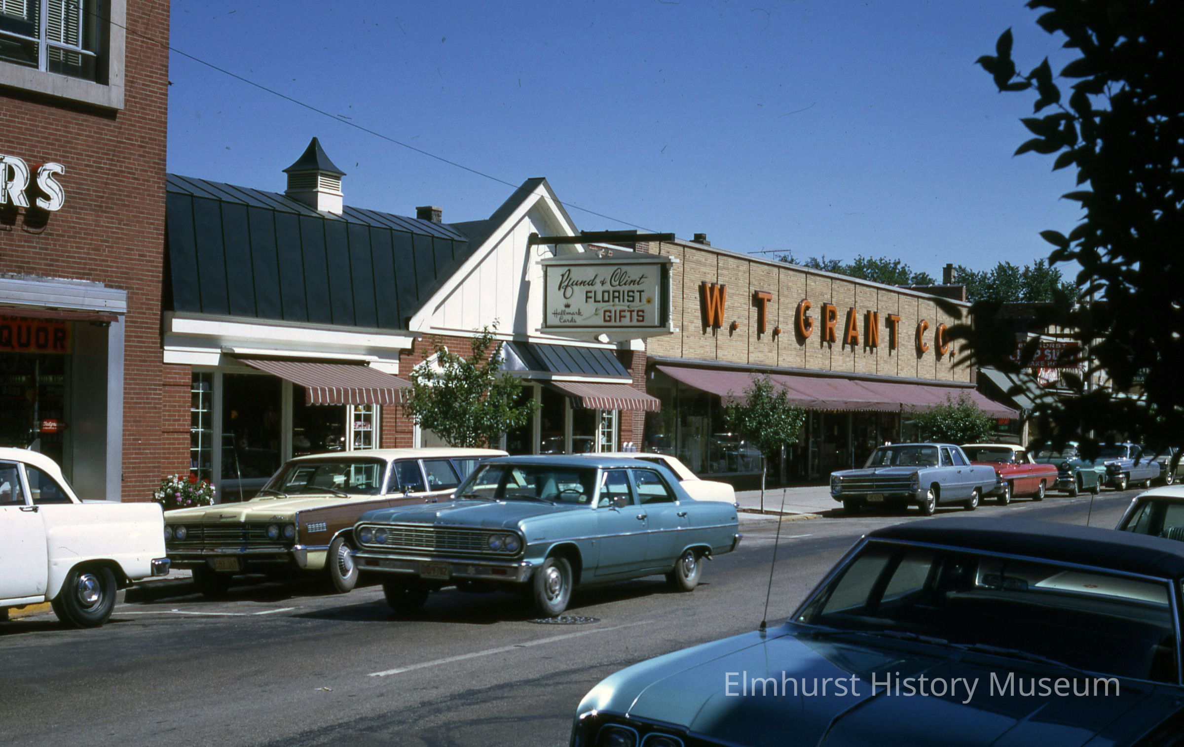 Storefronts on N. York Street, looking south from near Schiller Street. Shops include Pfund and Clint Florists at 123 N. York and W.T. Grant Company at 119 N. YorkPhotograph Details