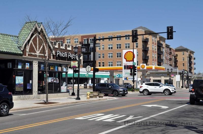 Intersection of N. York Street and Third Street, looking north towards the Shell gas station at 103 W. Third Street. Pinot's Pallette is visible at left at 214 N. York. Elmhurst 255 Apartments are visible in the background.Photograph Details