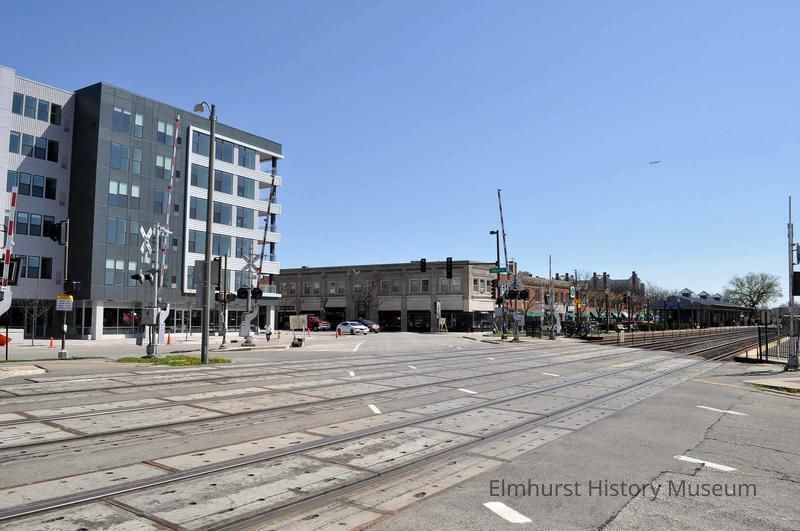 View of downtown from the Cottage Hill-Addison railroad crossing looking north towards the newly constructed Marke apartments at 100 N. Addison and the commercial building at 101 N. Addison.Photograph Details